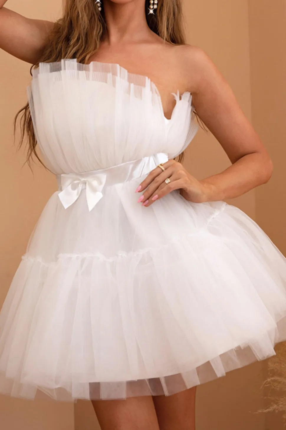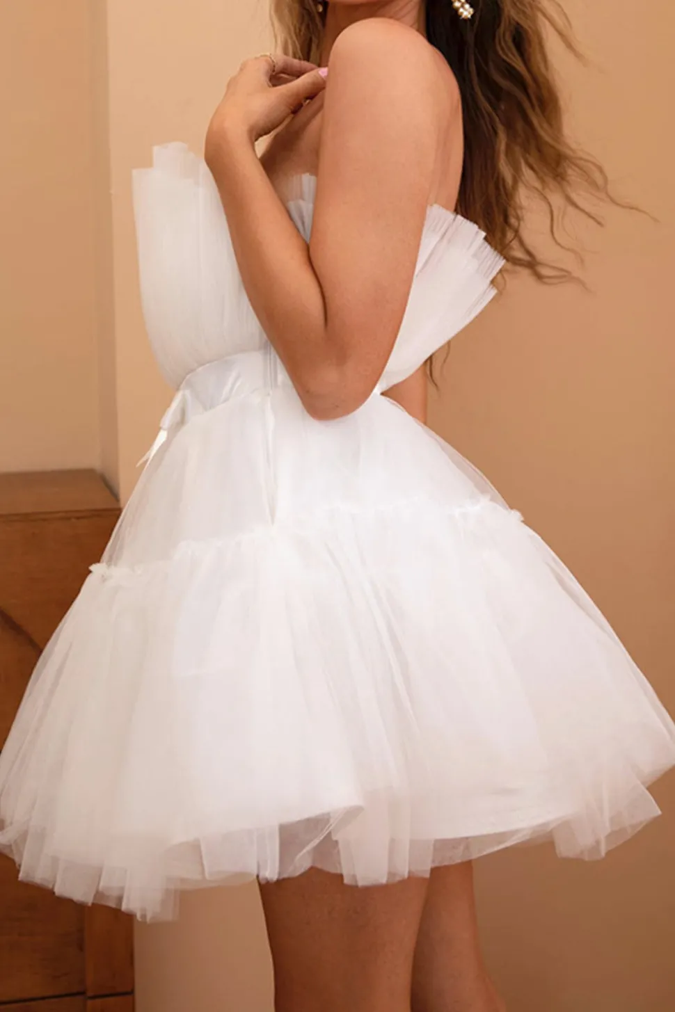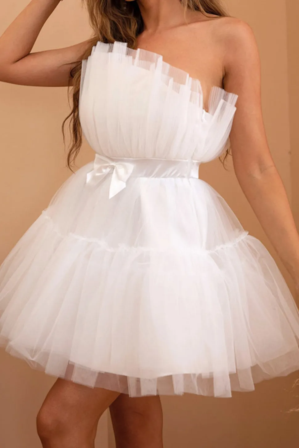 Fabric: Tulle. The fabric is comfortable for skin.