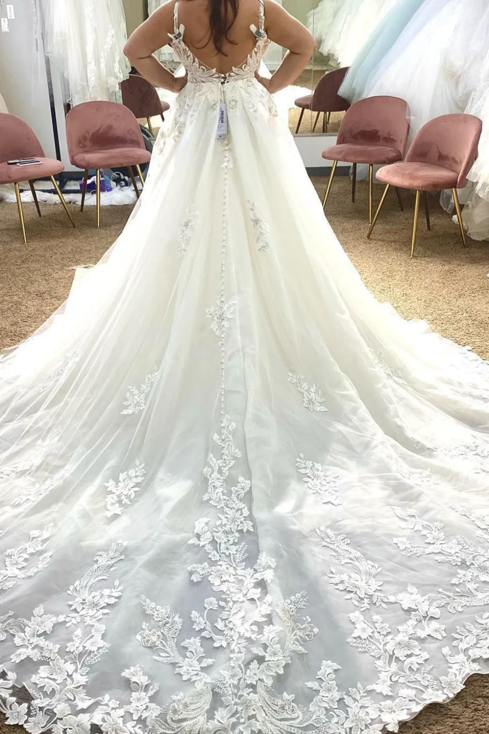 White A-Line Tulle Plus Size Long Wedding Dress with Appliques