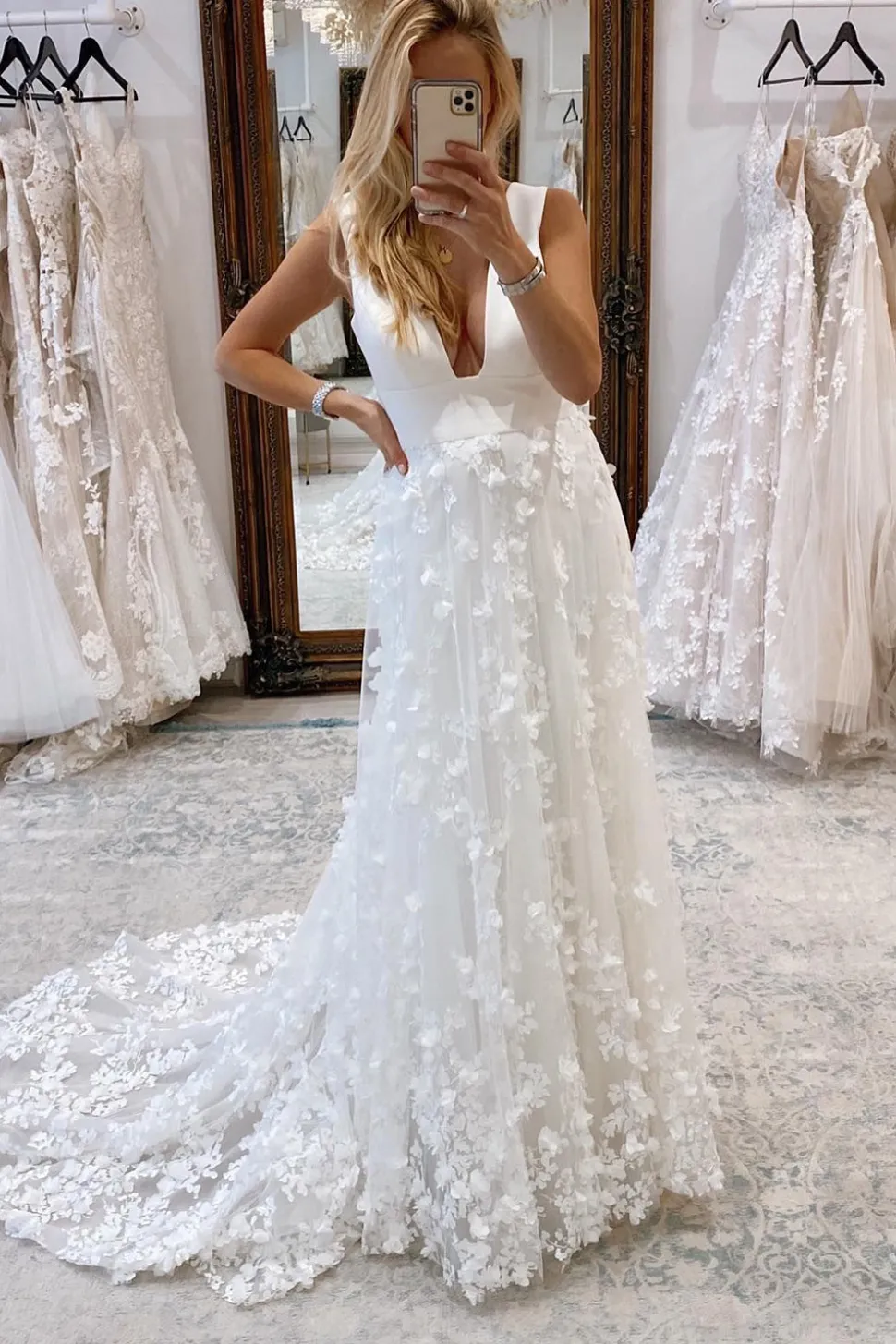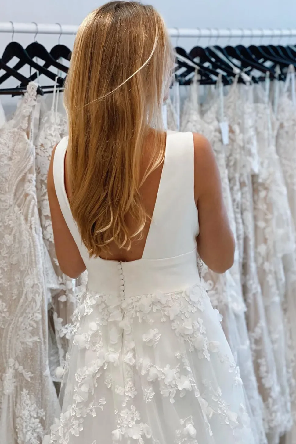 White Deep V-Neck Backless Long Wedding Dress with Appliques
