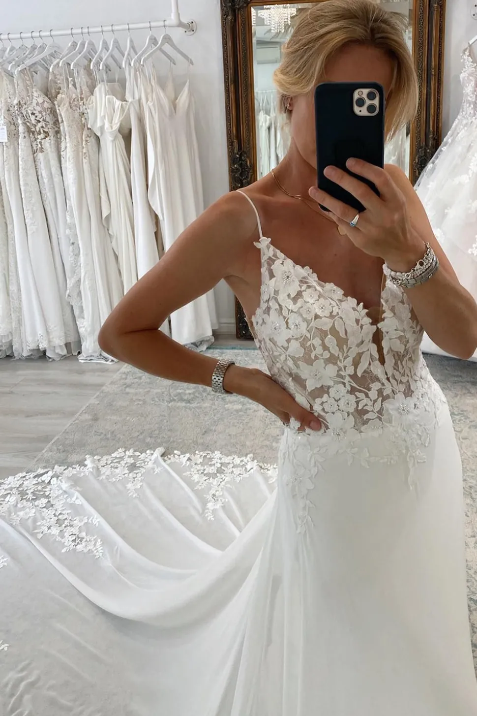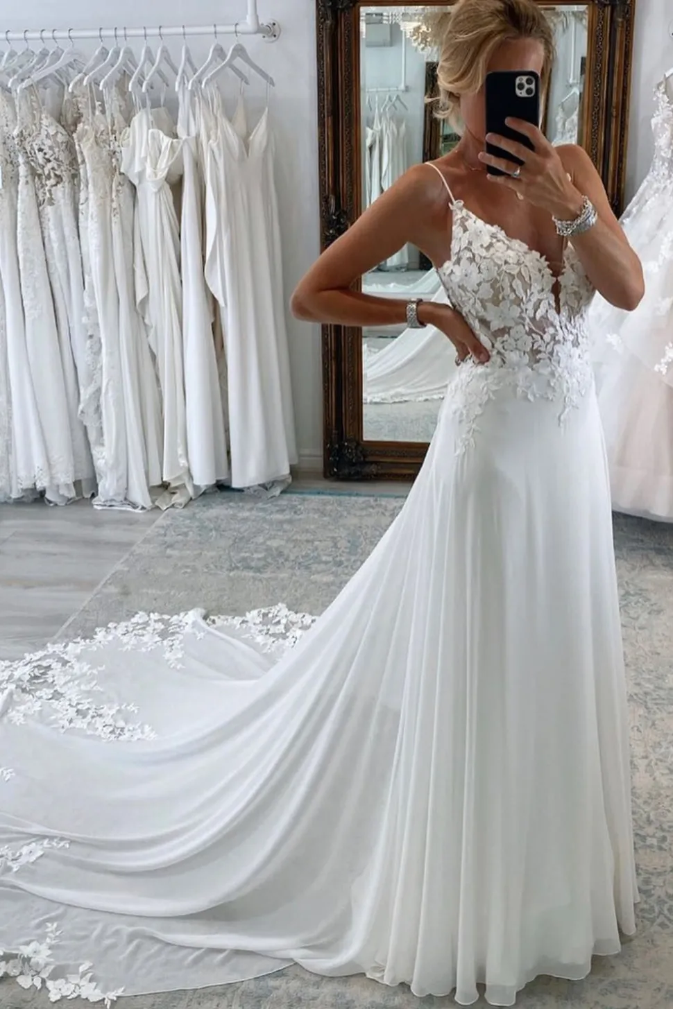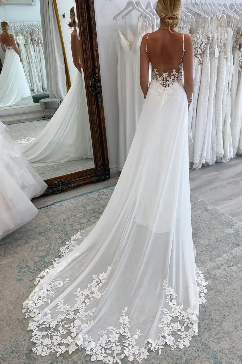 White Long Chiffon Boho A-Line Wedding Dress with Lace