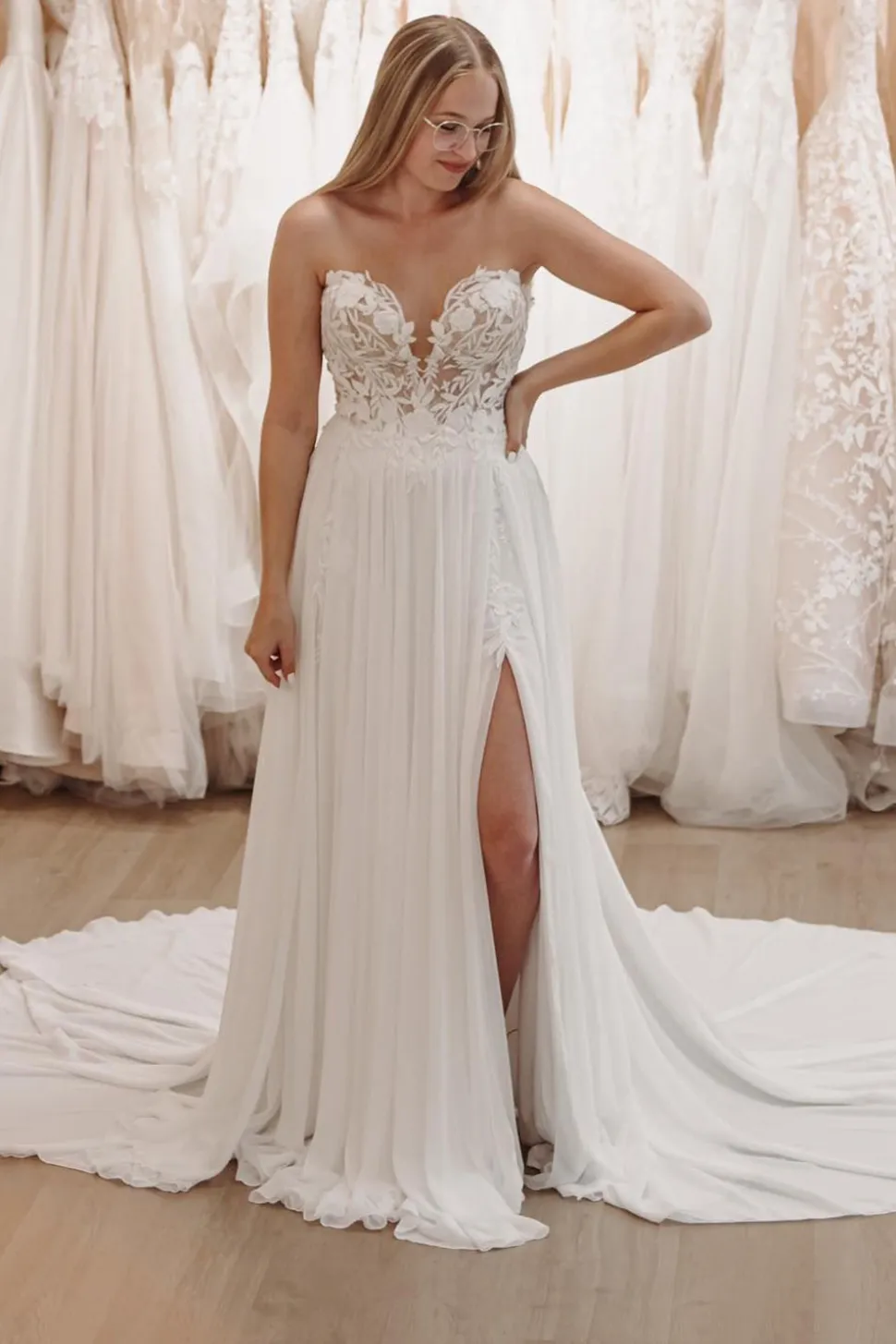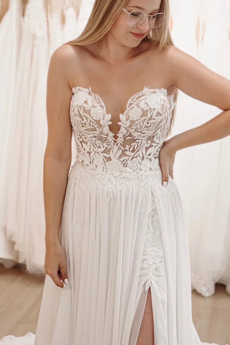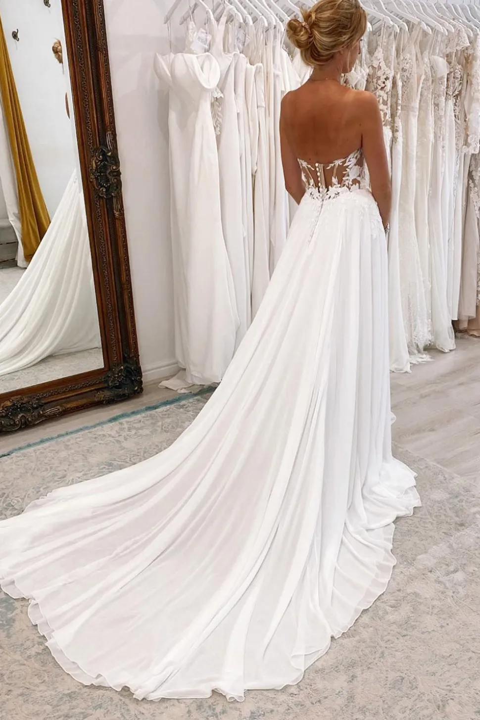 White Sweetheart Long Lace Boho Wedding Dress with Slit