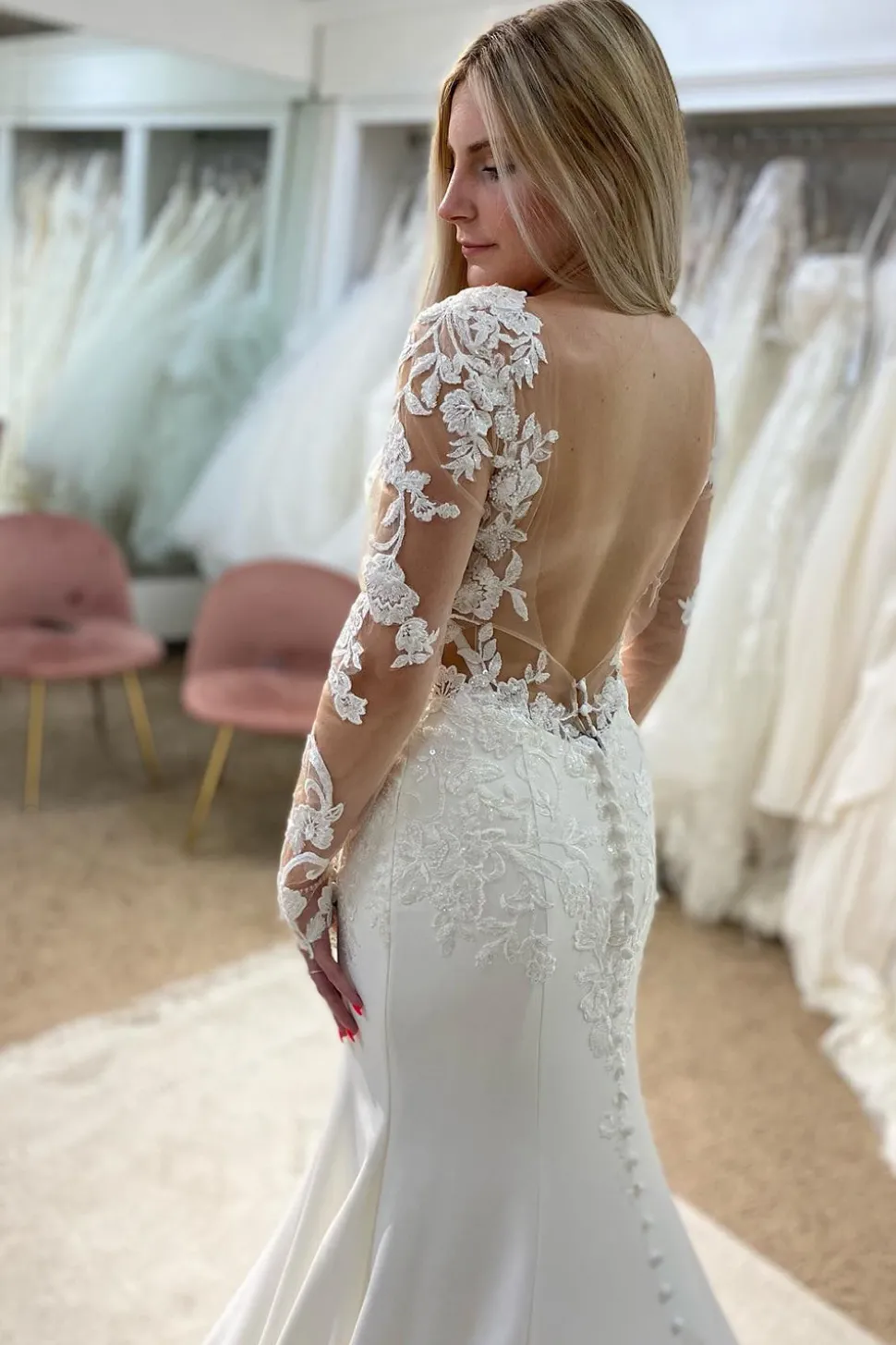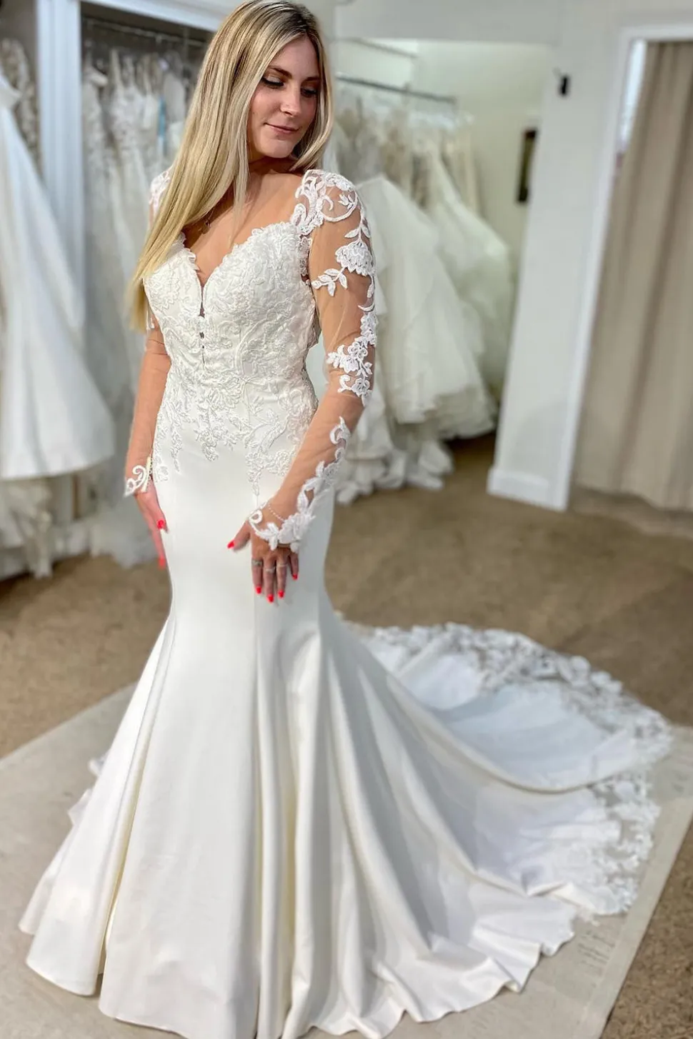 White V-Neck Mermaid Long Wedding Dress with Lace