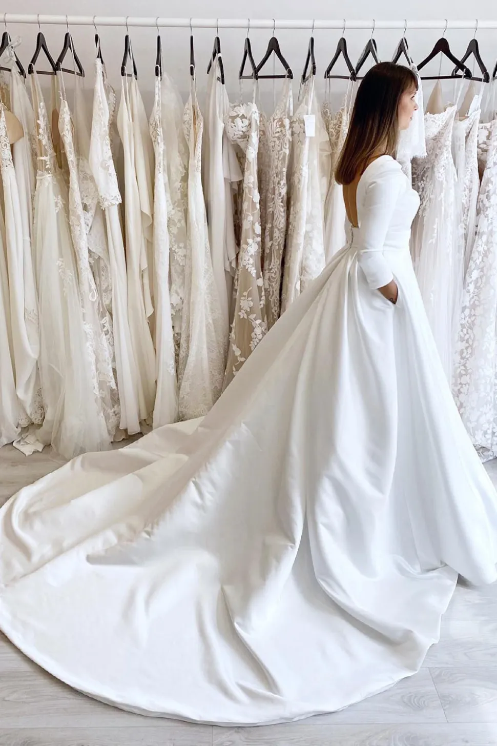 White Vintage A-Line Long Satin Wedding Dress with Pockets